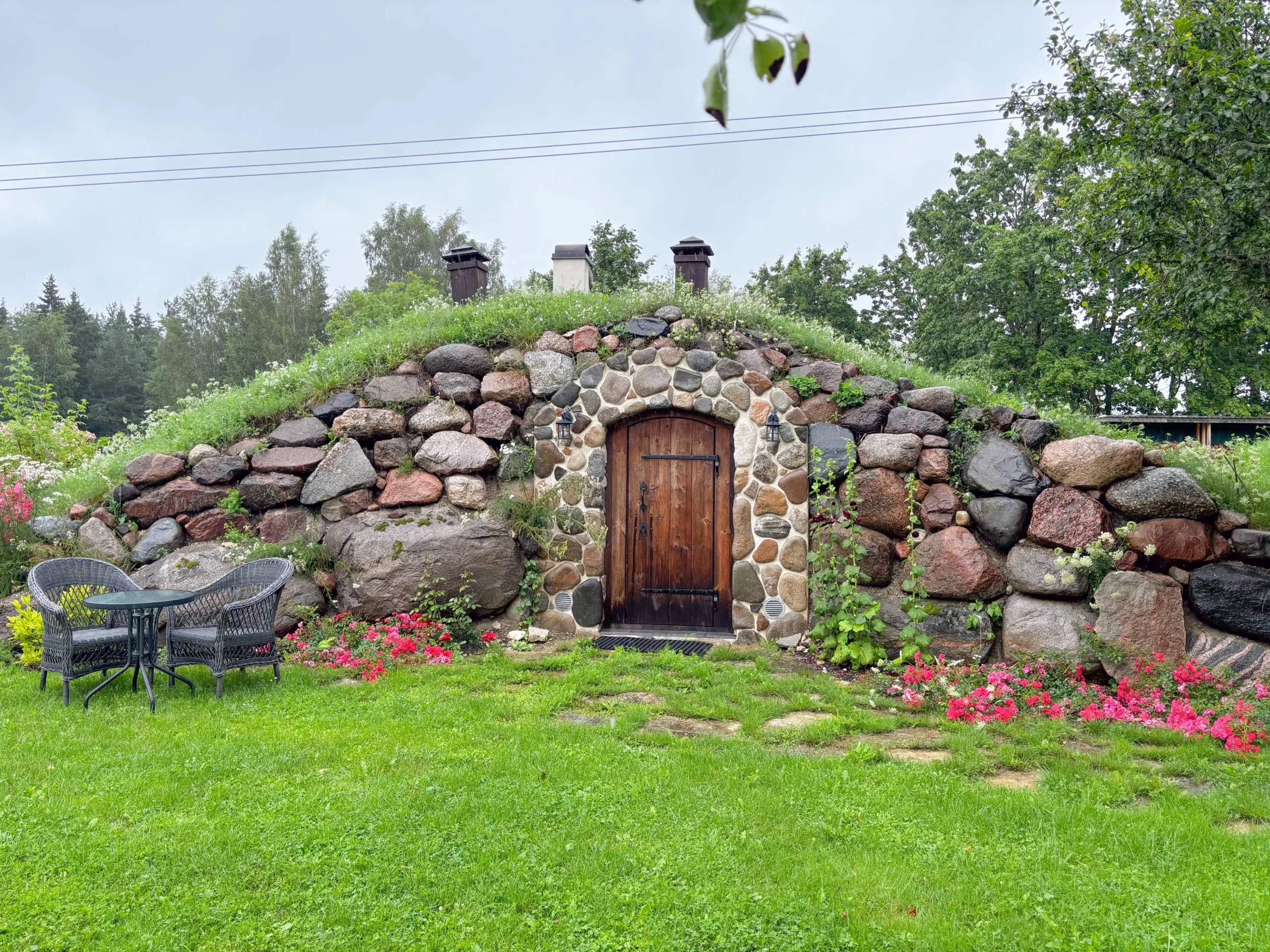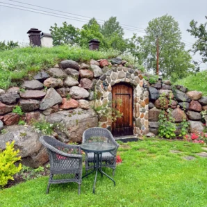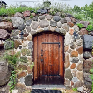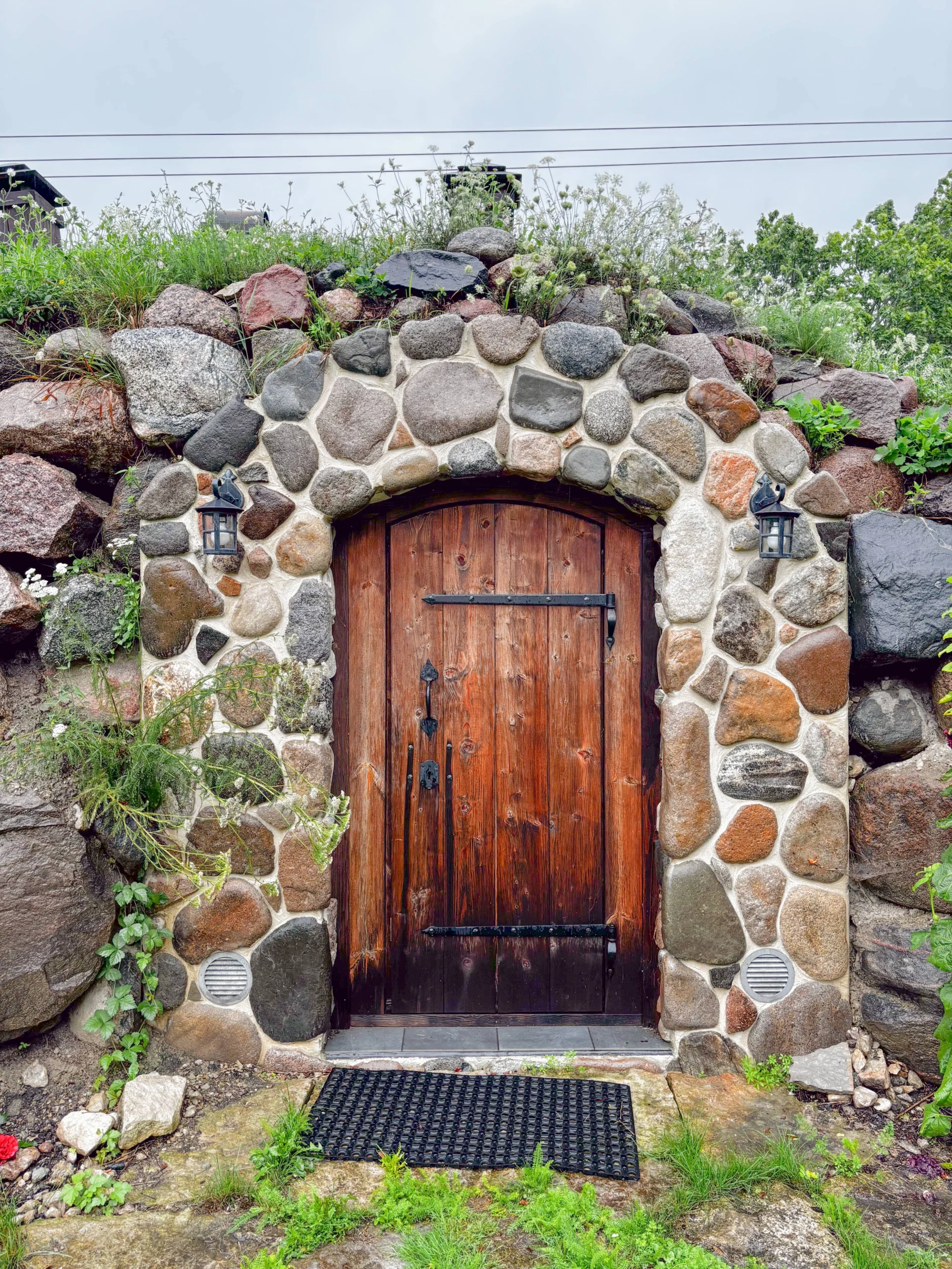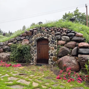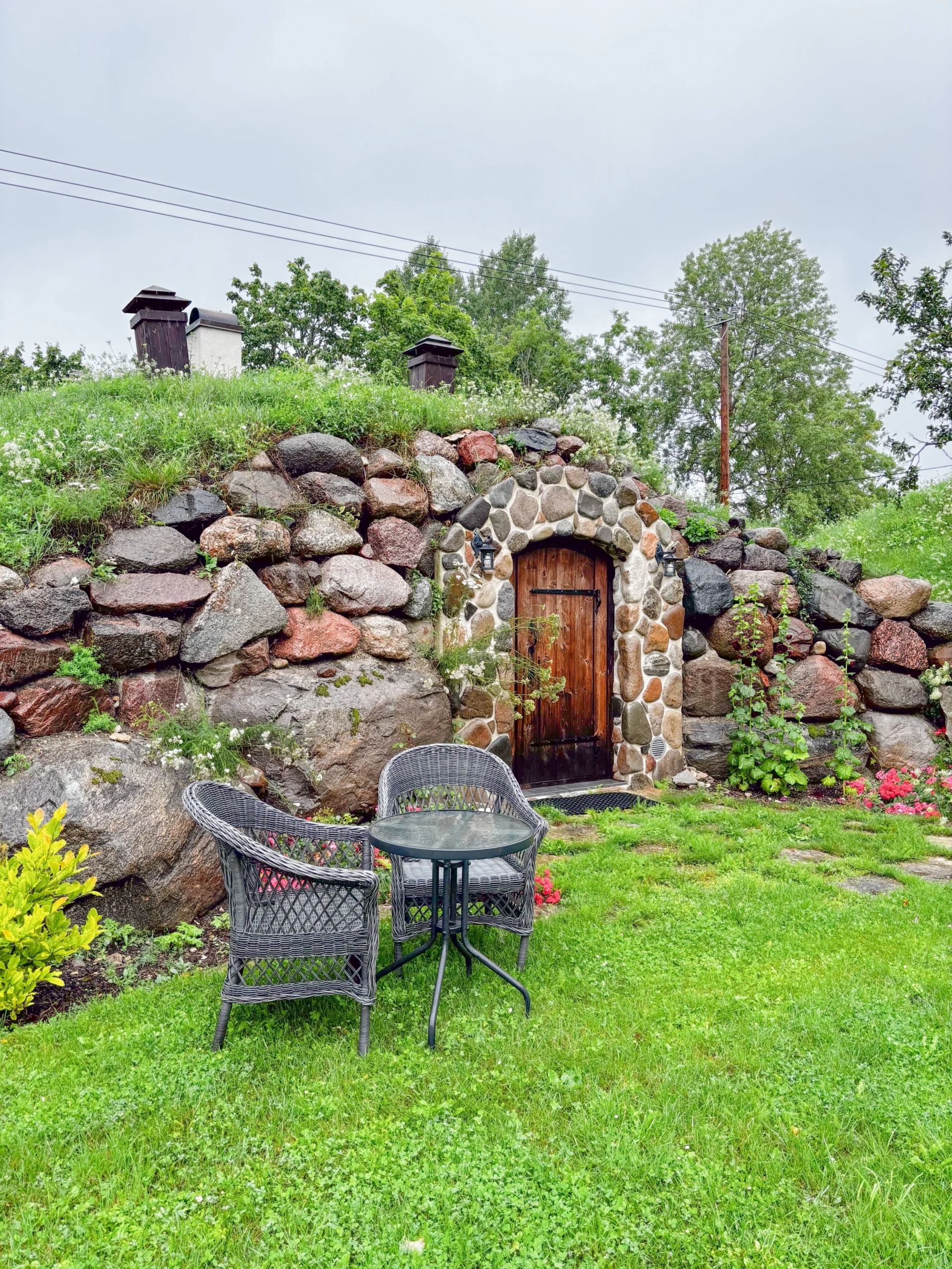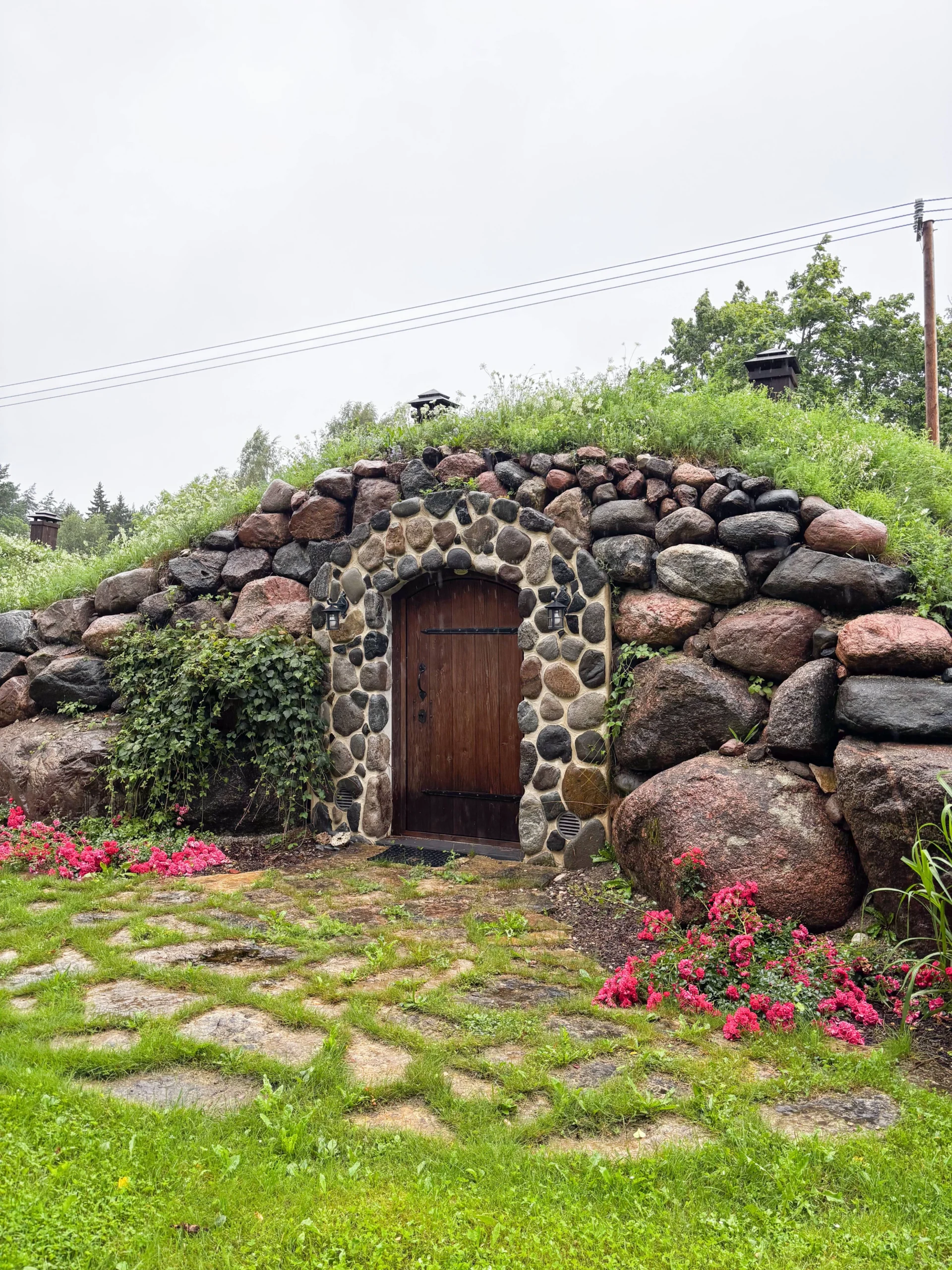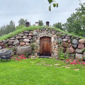 Eri suuruses kividest laotud fassaad ja kaarjas puidust uks loovad hubase ning vastupidava ilme. Haljaskatus pakub loomulikku soojust ja seob sauna ümbritseva rohelusega ühtseks tervikuks. Sissepääsu ääristavad hooldatud muruala, lillepeenrad ja väike istumisnurk, kus on mõnus pärast kuuma leili puhata.
