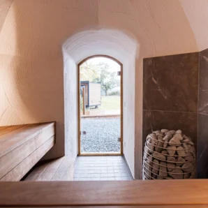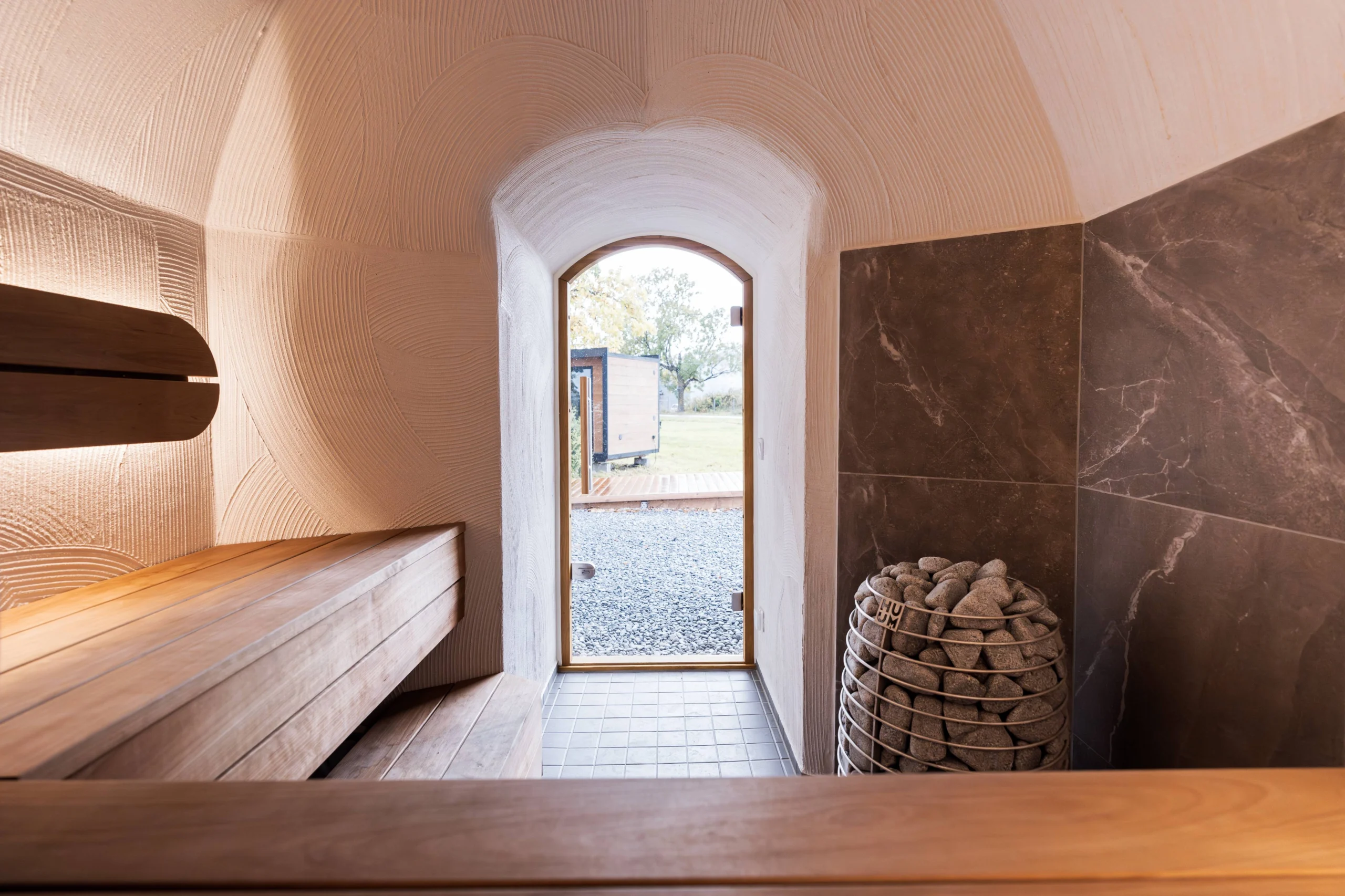 HUUMimaal asub saun, mis ühendab maaläheduse ja kaasaegse saunakultuuri. Kaarjas sissepääs ja krohvitud pinnad loovad loodusliku, hubase ilme, mida täiendab roheline katus.