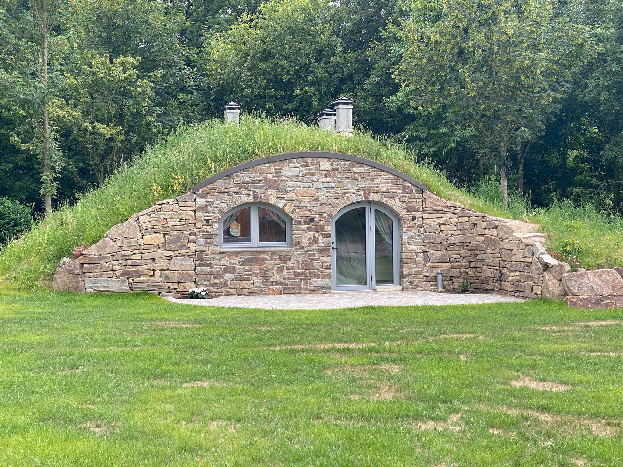 Iš išorės jis atrodo tarsi natūrali kalvos dalis. Įėjus pro arkinės formos duris, atsiveria pilnai įrengta, apgalvotai suprojektuota erdvė: virtuvė, svetainė ir vonios kambarys — visa tai sukurta iš arkinės betono konstrukcijos, kuri ištisus metus palaiko stabilią temperatūrą.